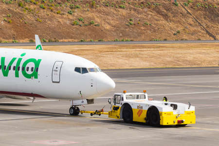 Funchal, Madeira - August 4, 2018: Equipment and airport workers on the airfield. Gangway going towards the aircraft. Sunny summer day, good weath