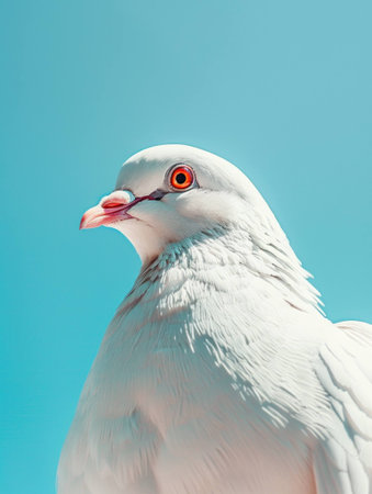 Close-up of a white pigeon against a clear blue sky, showcasing its detailed feathers and striking eye. Nature and wildlife concept.