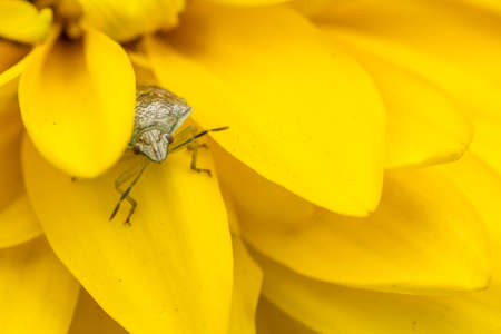 Green bug crawling on a yellow-red flower. Palomena prasina on Gaillardia.
