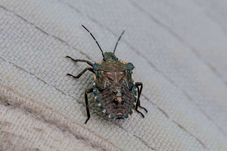 Southern green stink bug, nezara viridula sit on plant in forest, macro toned photo