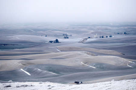 Rolling hills covered with frost and snow in winter. Foggy morning soft light on the farmlands in agricultural Palouse, southeast Washington. Moscow, Idaho. USA.