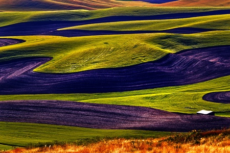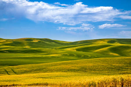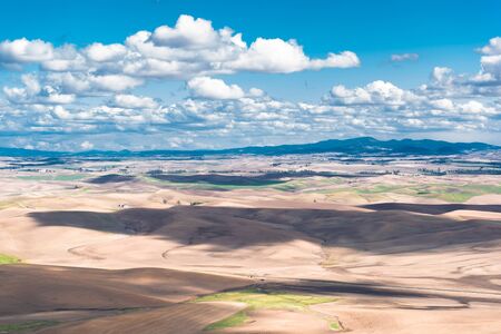Rolling fields of argricuture fields in eastern Washington State in the Palouse region with sunny summer blue skies