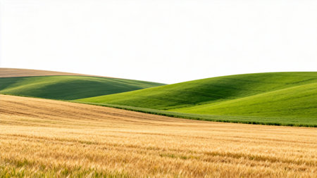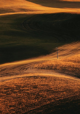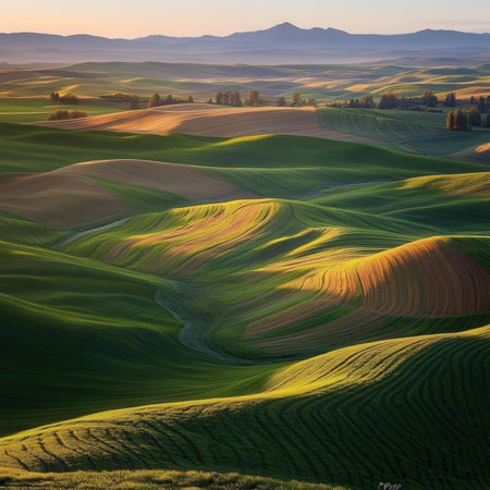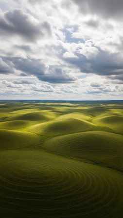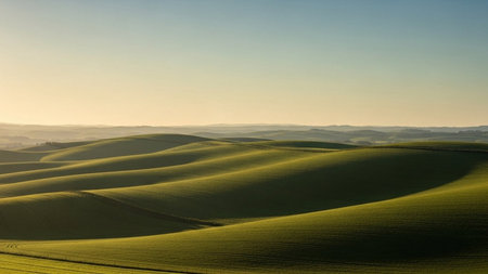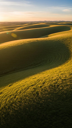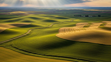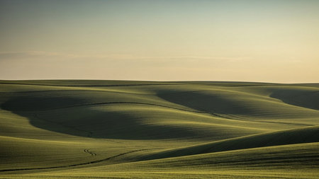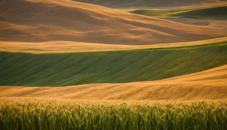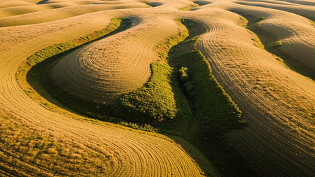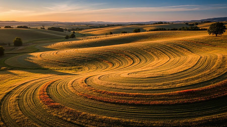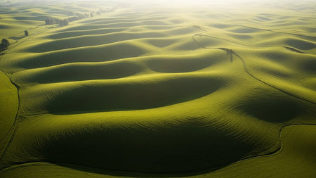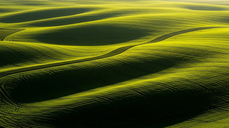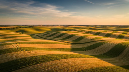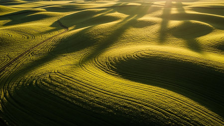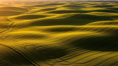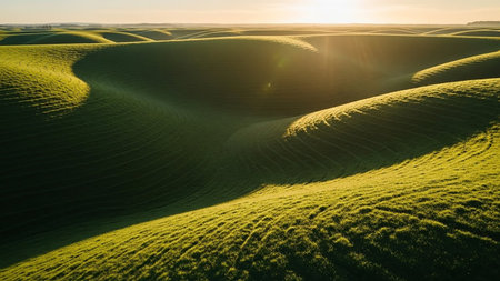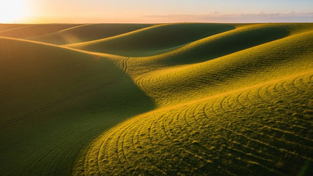 Golden hour sunlight bathes rolling green agricultural fields, highlighting organic curves formed by tractor tracks and soft shadows, creating a textured, serene...