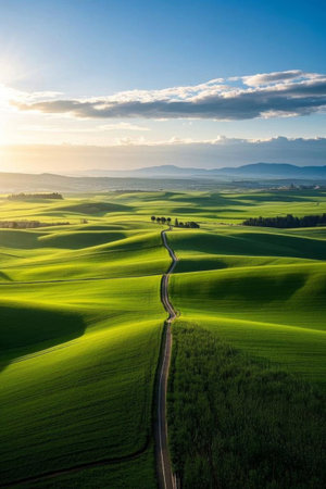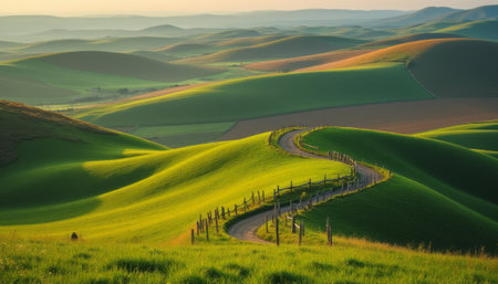 A picturesque winding road meanders through vibrant green hills, bathed in the warm glow of golden hour. The rolling landscape, dotted with gentle slopes and soft shadows, evokes a sense of tranquility and adventure in natures embrace.