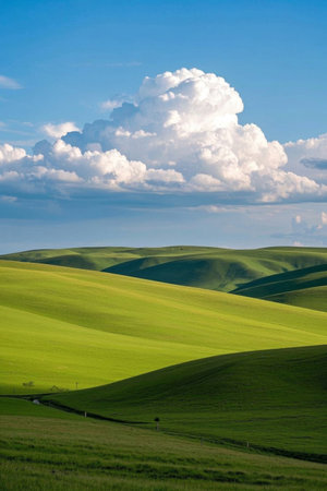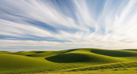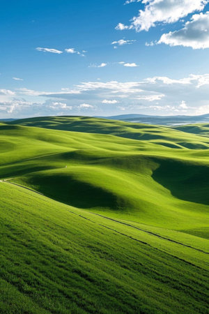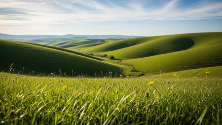 Rolling hills display bright green grass under a clear sky. Clouds drift above as spring colors come to life in a sunny landscape during the day.