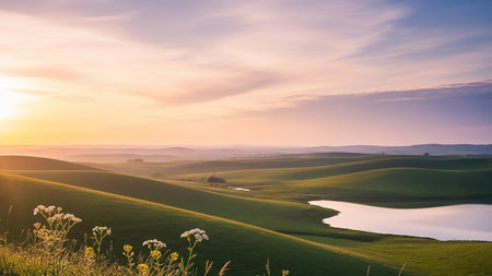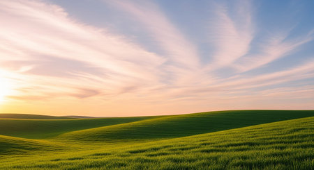 Foreground showing lush green grass in the foreground with rolling hills and a soft golden sunset sky in the background, creating a serene pastoral scene. keywords:...