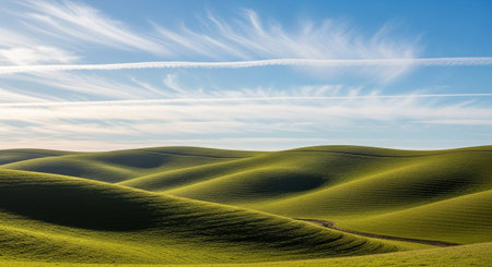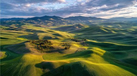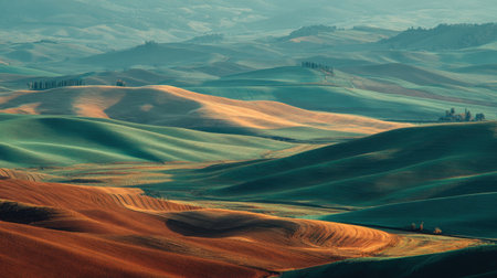 Sky showing undulating green agricultural fields with distinct curved rows of crops illuminated by soft morning or evening sunlight creating a smooth, flowing...