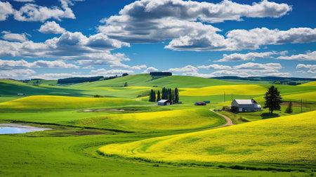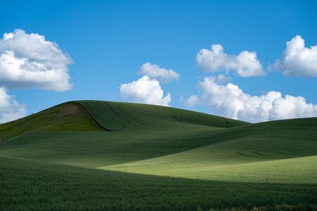 Sunny summer blue skies over rolling argricuture fields in eastern Washington State in the Palouse region