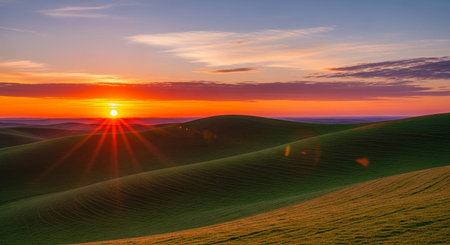 A breathtaking view of gently rolling hills at sunrise, showcasing vibrant orange and green fields bathed in soft morning light. Perfect for nature lovers.
