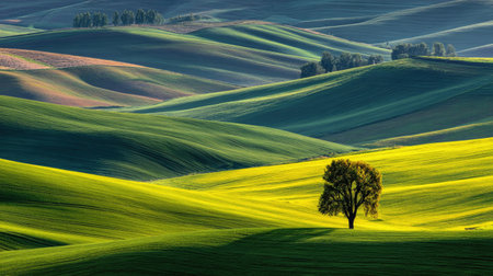 Explore the breathtaking beauty of rolling green hills under soft sunlight, with a solitary tree standing proudly amidst the vibrant landscape, inviting peace.