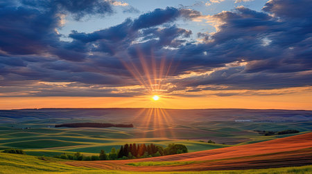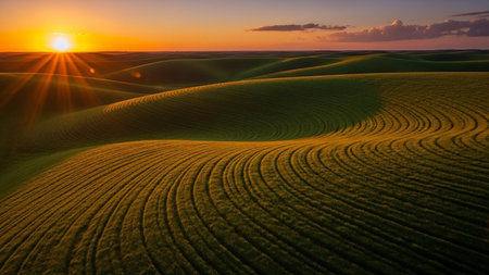 Agricultural showing golden sunset over rolling green agricultural fields with curved rows creating a landscape pattern and sunburst effect keywords: sunset,...