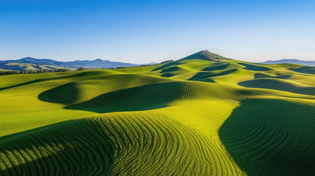 Vibrant green rolling hills display deep shadows and wavy patterns formed by tractor tracks under bright sunlight, showcasing agricultural cultivation.