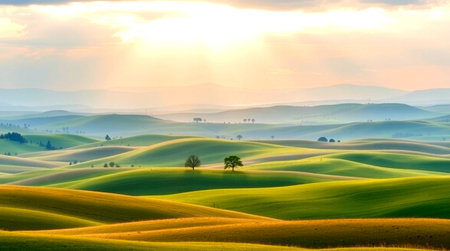 Beautiful rolling hills with green fields and scattered trees under bright afternoon sun