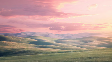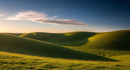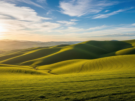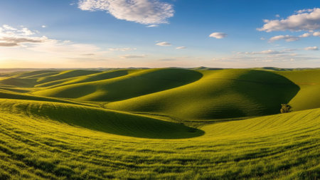 A serene landscape featuring rolling green hills under a clear blue sky with scattered clouds during sunset. The image captures the beauty of nature with its lush, undulating terrain and warm, golden light.