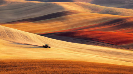 A breathtaking autumn landscape showcases rolling hills with a tractor plowing fields, capturing the essence of rural life in vibrant colors during golden hour.