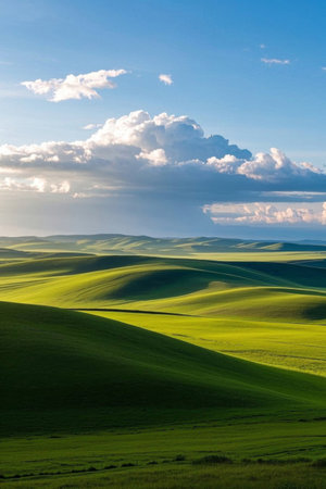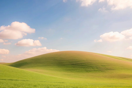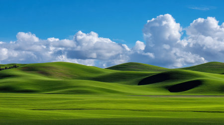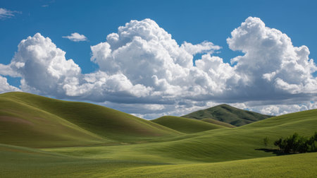 Experience the serene beauty of rolling green hills beneath fluffy white clouds and a stunning blue sky, capturing the tranquility of nature in this picturesque landscape.