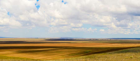 Panorama. Yellow fields and cloudy sky. In the fields, the shadow of the clouds.