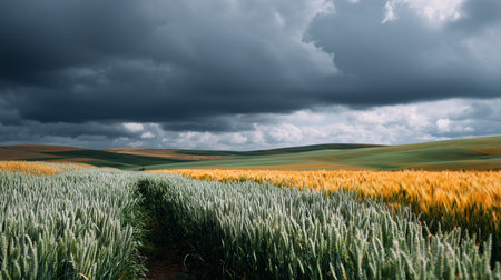 Cloudy day over golden and green wheat fields in a rural landscape