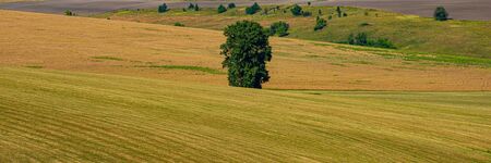 Single linden tree in the field after the harvest of wheat, panorama. Summer season, august. Web banner.
