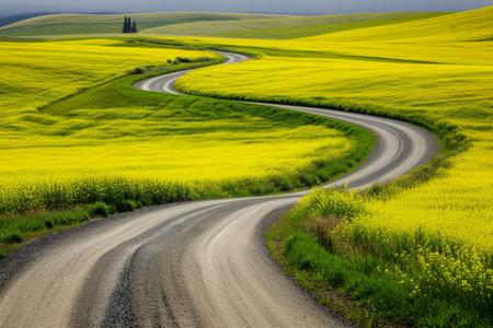 A road cuts through a vibrant field of yellow flowers, creating a striking contrast against the green landscape, A winding road through bright yellow canola fields, AI Generated