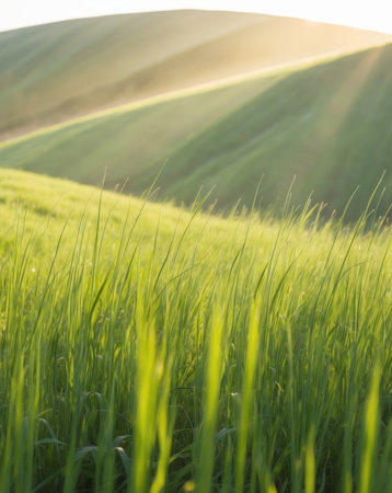 AI Generated. Lush Green Grass Meadow Landscape with Sunbeams