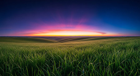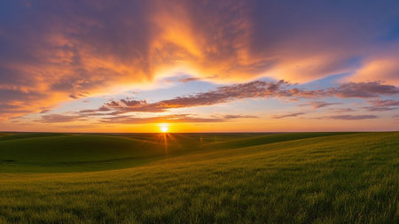 A mesmerizing sunset paints the sky in vivid hues as it casts a warm glow over rolling hills adorned with vibrant flower fields, showcasing nature's beauty.