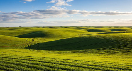 Undulating green fields create a pattern of light and shadow under a soft sky, showcasing the vastness of cultivated land.