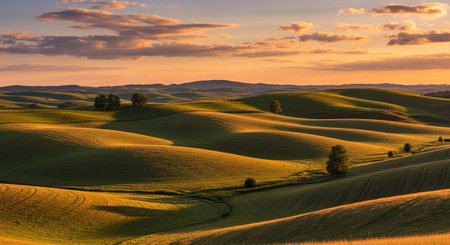 Undulating green hills of farmland stretch across the horizon, sculpted by the soft, golden light of either sunrise or sunset. Deep shadows carve out the curves and contours of the land, creating a dramatic interplay of light and form. The grass appears lush and well-maintained, suggesting a productive agricultural landscape. A few scattered trees stand silhouetted against the sky on distant hilltops. The overall mood is one of peacefulness, vastness, and natural beauty, highlighting the...