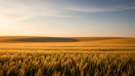A vast, rolling field of golden wheat stretches to the horizon under a soft sunset sky. The light creates gentle shadows and highlights the texture of the grain, symbolizing a bountiful harvest and rural beauty.
