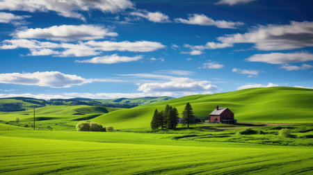 Expansive rolling green wheat fields create undulating patterns under a bright blue sky with scattered white clouds...