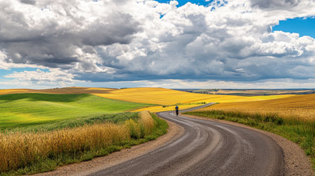 A cyclist rides a winding hill road bordered by golden fields and green pastures under a dramatic cloudy sky.