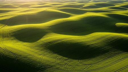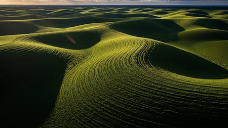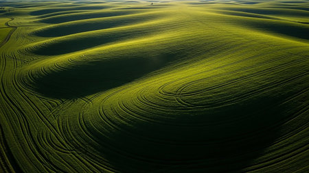 (2604) showing expansive green agricultural landscape with undulating hills and swirling furrows under dramatic sunlight and shadow play. resolution