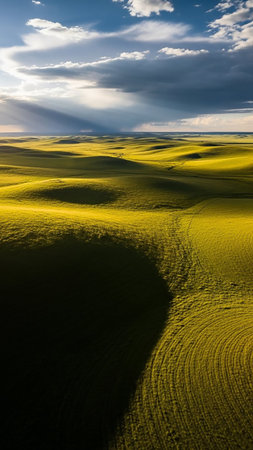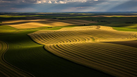 Illuminating showing expansive rolling agricultural fields of golden wheat crops under a dramatic cloudy sky with soft sunlight casting shadows across the...