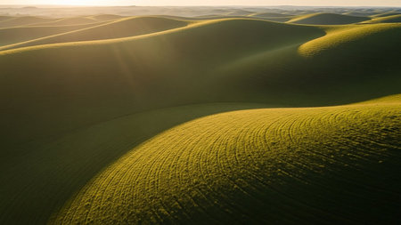 Gentle, rolling green hills illuminated by warm golden sunlight, casting soft shadows and revealing subtle curved patterns from cultivation in the fields.