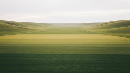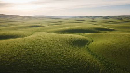 Natural showing gentle rolling green hills with subtle curved patterns of light and shadow under a soft hazy sky creating a vast and peaceful agricultural landscape...