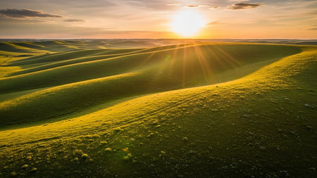 Rolling green and golden hills bathed in the warm light of a vibrant sunset, with sun rays illuminating a winding path.