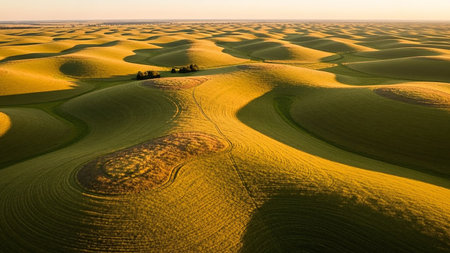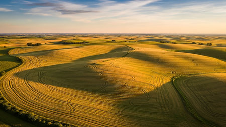 Undulating green agricultural fields bathed in the warm, soft light of a golden hour sunset, showcasing swirling patterns from harvested crops.