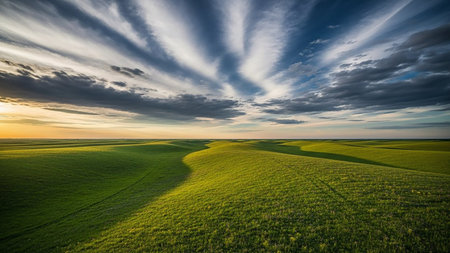 Vast showing rolling green hills under a dramatic cloudy sky at sunset showing a vast agricultural landscape with textured grass and soft light. resolution...