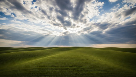 Farmland showing rolling green hills under a dramatic sky with sunbeams breaking through dark clouds creating a serene and landscape scene keywords: rolling, green,...