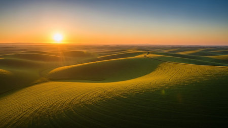 Undulating green fields catch golden sunlight, casting soft shadows and revealing subtle tire tracks across the vast, rolling landscape.