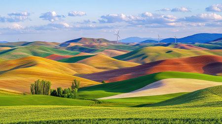 Expansive rolling green hills are adorned with meticulously cultivated fields displaying vibrant stripes of yellow sunflowers and purple lavender, interspersed with green wheat. A gentle stream meanders through a lush meadow where cows graze peacefully. In the distance, a wind turbine stands tall against a clear blue sky, and a tractor works the land, symbolizing modern agriculture. This idyllic rural scene evokes a sense of tranquility and the beauty of cultivated nature.