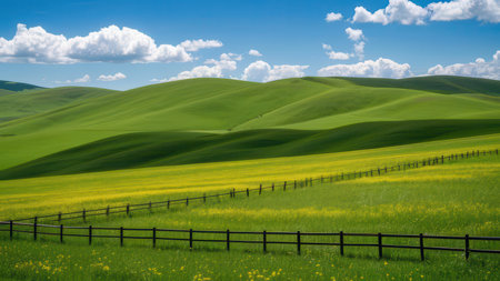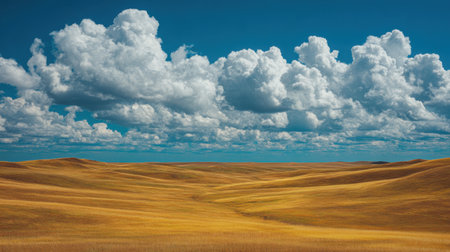 Experience the beauty of rolling hills adorned with golden fields under a vibrant blue sky, showcasing fluffy clouds in a peaceful rural landscape during a sunny day.
