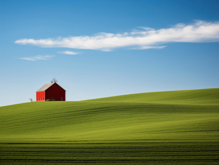 A red barn sits in the middle of a green field, AI