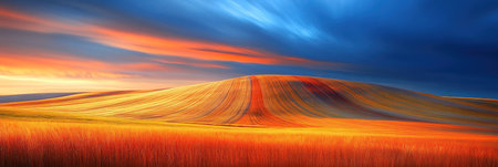 A panoramic view of rolling hills and cultivated fields bathed in the warm, golden light of sunset. The undulating landscape is sculpted by soft shadows and highlights, emphasizing its gentle contours. Dramatic clouds drift across the sky, catching the last rays of the sun and casting a warm glow over the scene. The overall atmosphere is one of profound peace and natural beauty, showcasing the serene and idyllic charm of the countryside during the golden hour.