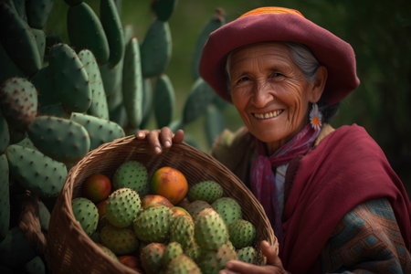 Portrait of a smiling woman holding a basket of fresh cactus fruit with green cactus plants in the background