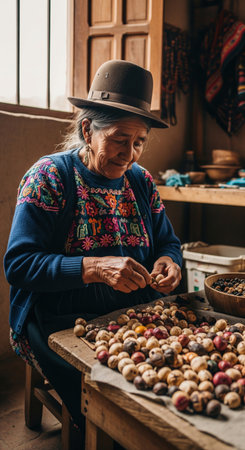 Elderly indigenous south American woman in traditional clothing sorting seeds. A portrait of an authentic and wise female farmer at work.