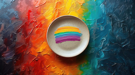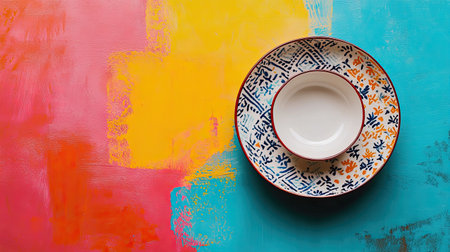 A beautiful ceramic plate rests atop a vibrant background filled with artistic brush strokes in yellow, orange, and aqua, showcasing a modern dining aesthetic perfect for food photography.