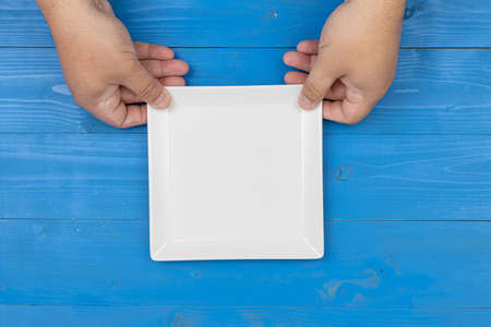 Top view of woman hands holding white empty plate on wooden background with copy space