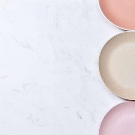 Corner frame with porcelain empty plates on a gray marble table. Pastel colored ceramic vintage handmade dishes.