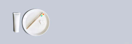 Ecology toothbrush on grey background. Brush on plate. Breakfast concept. Sustainable mouth product. Zero waste lifestyle. Organic accessory. Dental health at home. Biodegradable recycle. Toothpaste